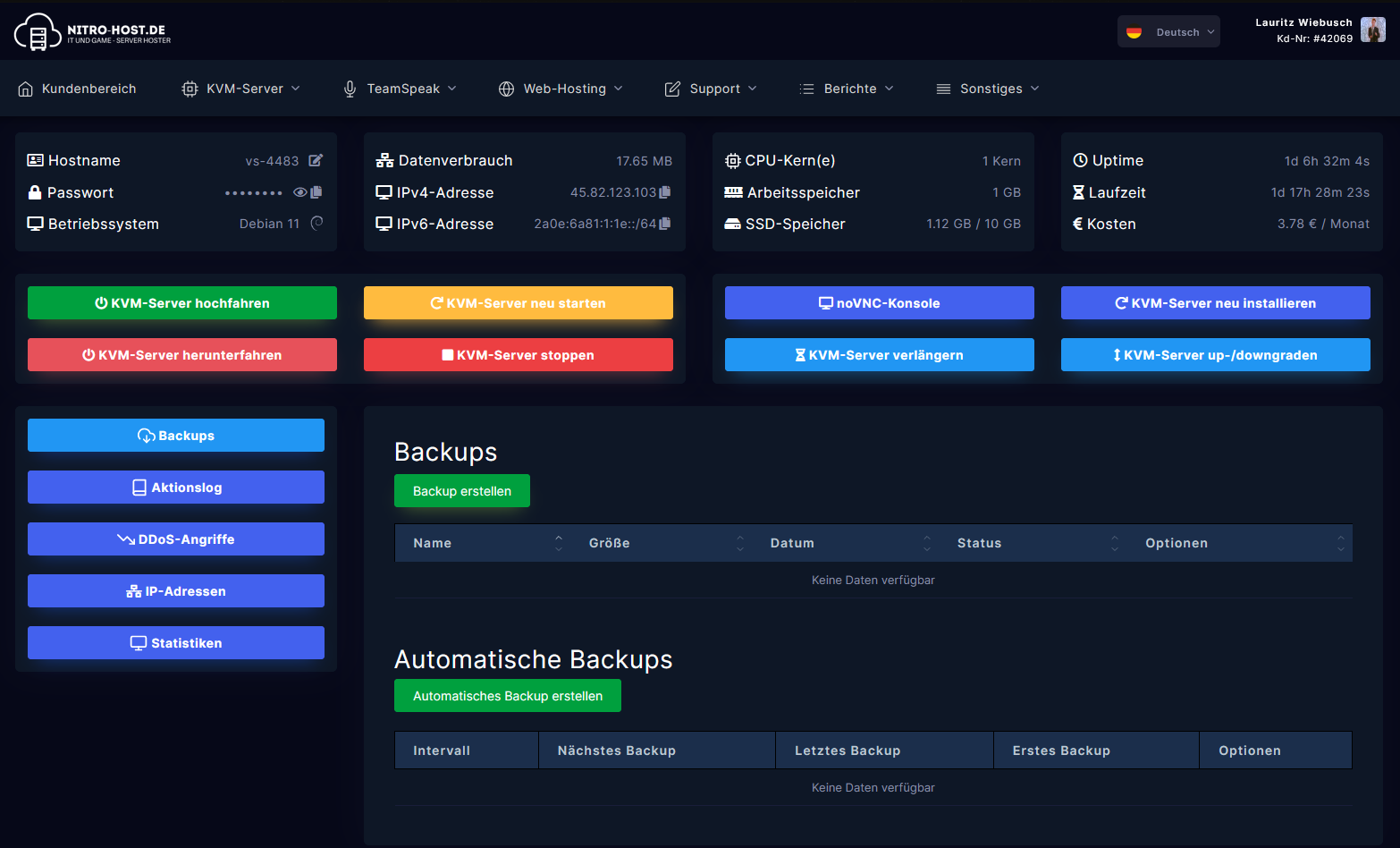Öffne dein KVM-Server-Dashboard und scrolle nach unten. Dort kannst du auf "Automatisches Backup erstellen" klicken und alles einstellen, was du brauchst.